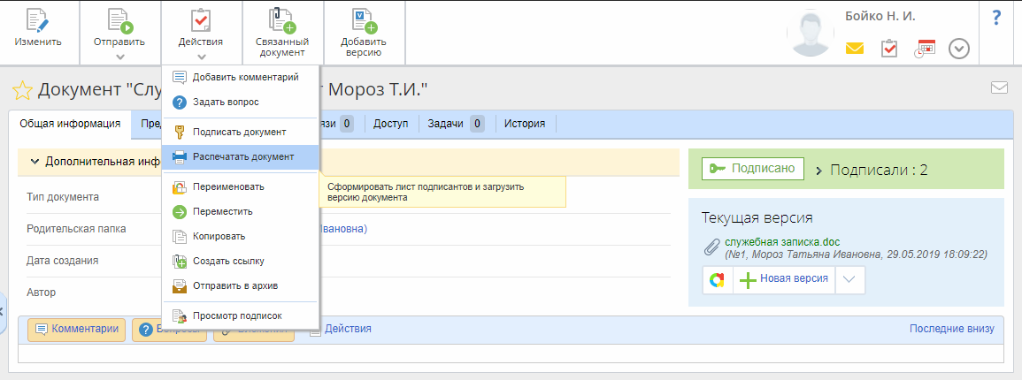 После установки модуля в списке доступных действий на карточке документа в ELMA появляется возможность распечатать документ, подготовленный по определенным правилам:
