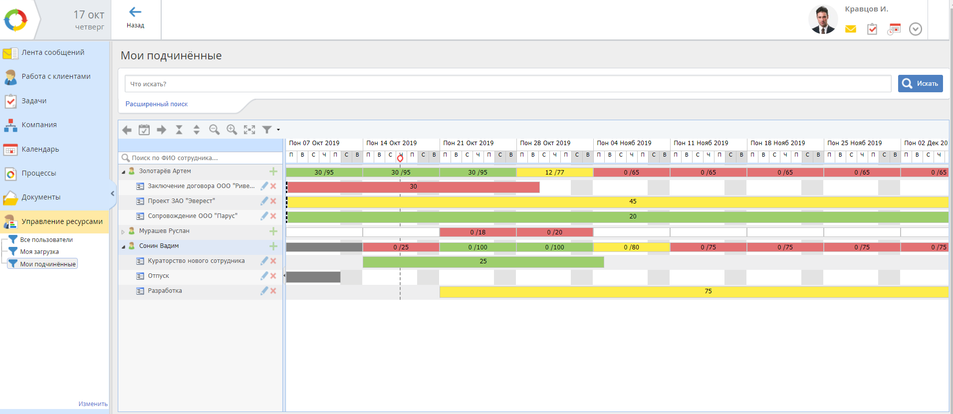 Контролируйте возможности своей команды и загрузку каждого сотрудника с помощью модуля «Управления ресурсами».