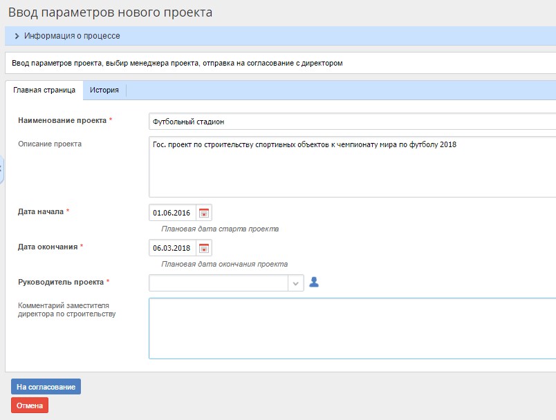 Параметры нового проекта отправляются на согласование вышестоящим руководством, после чего назначенный руководитель проекта автоматически получает задачу создать проект строительства в системе ELMA.