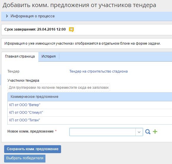 После согласования итогов тендера руководитель проекта получает задачу уведомить участников о принятом решении.